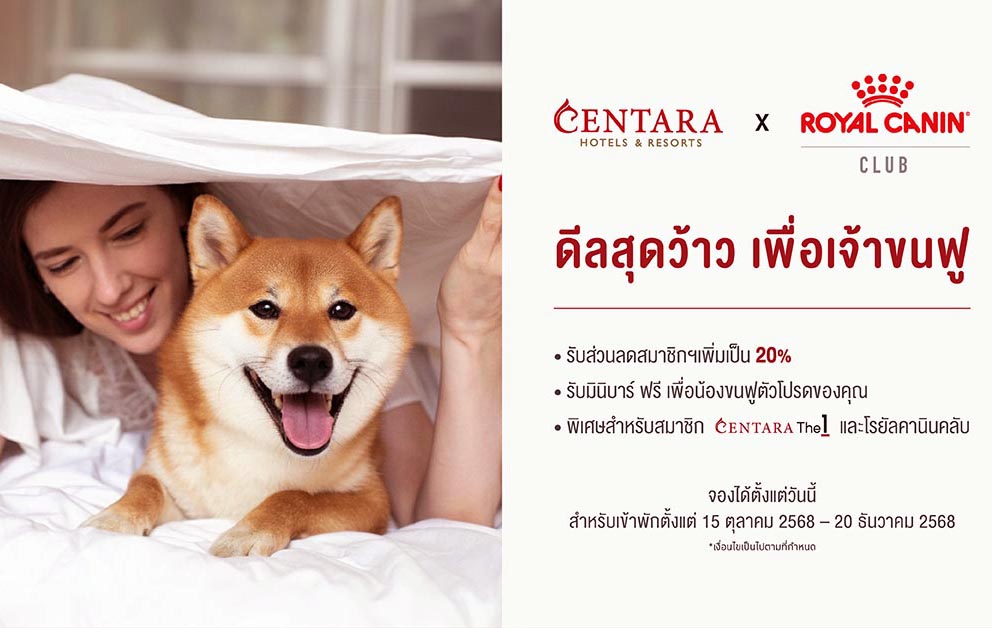 Centara Hotels & Resorts has joined hands with Royal Canin to launch a new nationwide campaign catering to pet owners, offering up to 20% off room rates along with special perks for pets. This collaboration strengthens Thailand’s growing pet-friendly travel market, giving guests and their furry companions luxurious stays across nine Centara destinations. Reservations are available until 20 December 2025 for stays from 15 October to 20 December 2025. This Room Promotions news report highlights that CentaraThe1 and Royal Canin Club members receive additional privileges such as a complimentary Royal Canin pet minibar, priority booking access, and late check-out flexibility for an even more enjoyable experience.