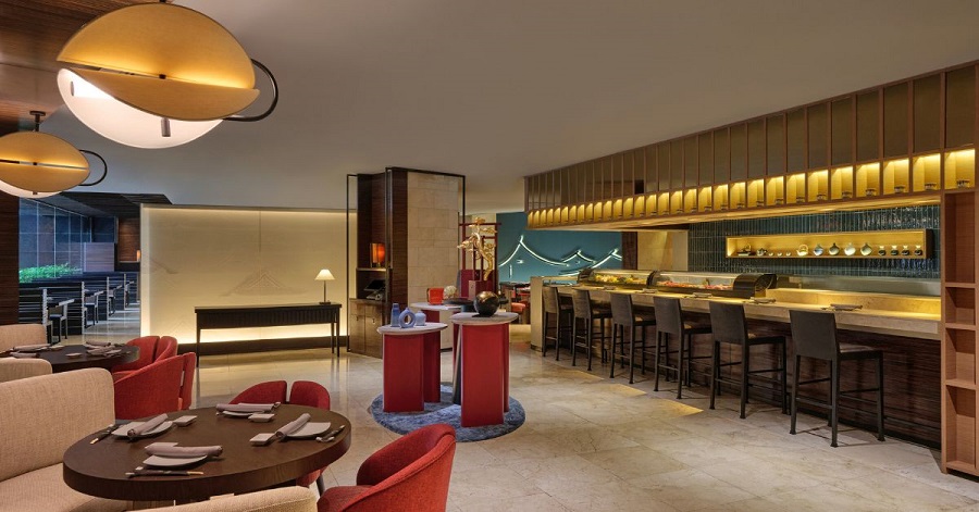 The word Nami, meaning “wave,” symbolizes movement, energy, and transformation—concepts vividly captured in its contemporary interior and vibrant dishes. Flowing fabric installations and azure lighting evoke the fluid rhythm of the ocean. The restaurants share a sophisticated Sake Bar connecting both spaces, illuminated by wave-inspired lamps and the elegant Japanese kanji for “Nami.” Guests experience live culinary theatre as chefs prepare premium ingredients such as Boston lobster, A5 Miyazaki beef sirloin, Australian Wagyu tenderloin, tiger prawns, and Hokkaido scallops right before their eyes. Signature dishes like smoked duck salad and cold udon noodles with truffle sauce perfectly balance the artistry of Japanese tradition with international flair, offering a multi-sensory journey of taste and design.